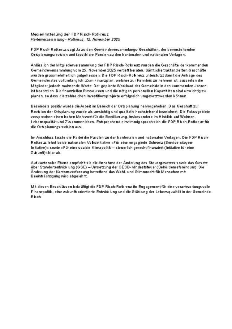 Medienmitteilung zur Parteiversammlung